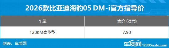 日前云资管,车质网从官方获悉,2026款海豹05 DM-i正式上市,此次仅推出1款车型,售价7.98万元。新车在配置上与智驾版55KM豪华型基本保持一致,售价不变,CLTC纯电续航提升至128km。